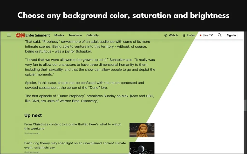 - Real Color, Not Just an Overlay: Instead of just dimming the screen, we change the actual background color of bright sections. This provides deeper comfort and makes text even easier to read.